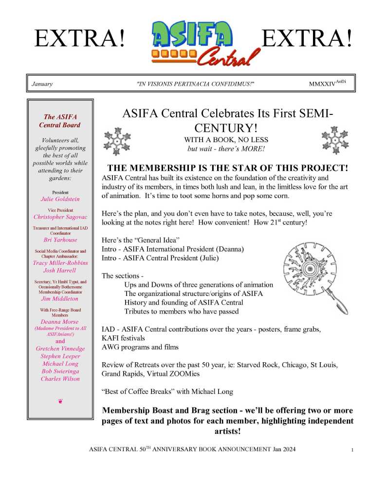ASIFA Central! We are the midwest chapter of ASIFA, and that is the oldest organization of animators IN THE WORLD, if not the UNIVERSE! Our chapter was established in 1975.